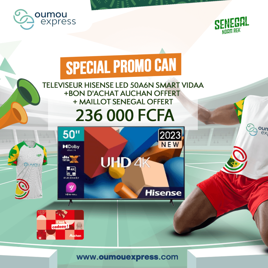 TELEVISEUR HISENSE LED 50A6N SMART VIDAA +BON D’ACHAT AUCHAN OFFERT + MAILLOT SENEGAL OFFERT