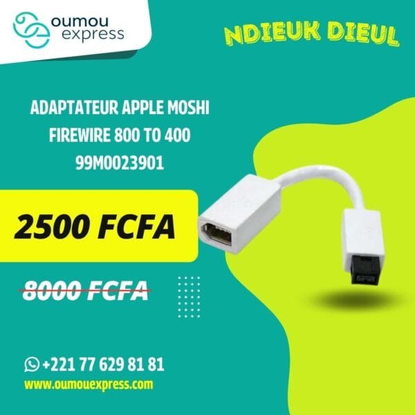ADAPTATEUR APPLE MOSHI FIREWIRE 800 TO 400 99M0023901 Le prix initial était : 8.000CFA.Le prix actuel est : 2.500CFA.