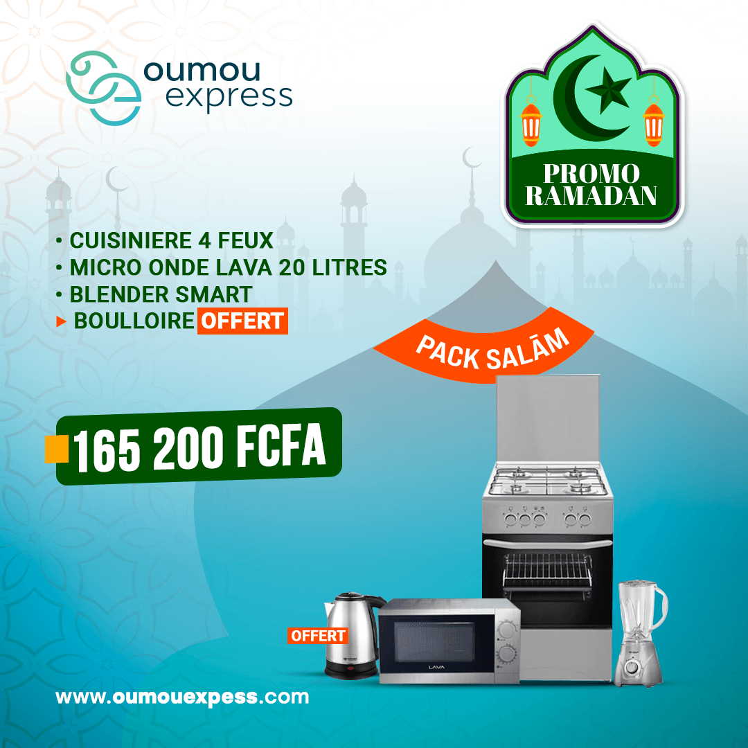 Accueil | Boutique | Ramadan2026 | CUISINIERE 4 FEUX • MICRO ONDE LAVA 20 LITRES • BLENDER SMART • BOULLOIRE OFFERT